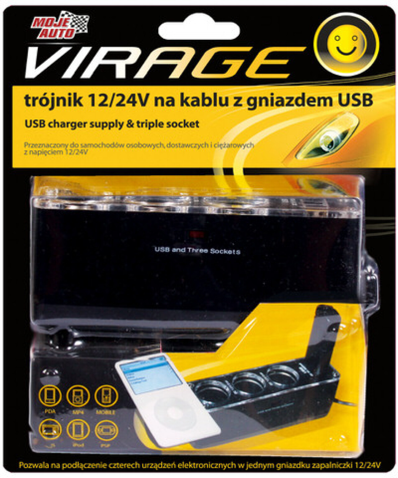 Umožňuje pripojiť štyri elektronické zariadenia do jednej zásuvky zapaľovača 12/24V. Má výstup USB zásuvky 5VDC/500mA (max). 70 cm dlhý kábel. Rozmery zariadenia sú 11,5 x 3,2 x 5 cm. Maximálny výkon pripojených zariadení až 120W.