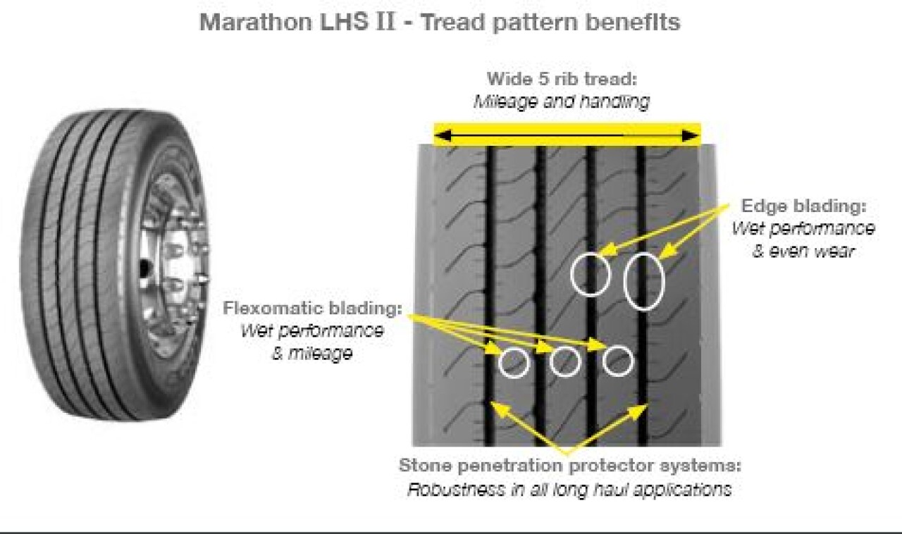 Goodyear Marathon LHS II 22;5. Nová pneumatika Goodyear pro řízenou nápravu a dálkovou dopravu využívající technologii MAX TECHNOLOGYNová generace pneumatik pro řízenou nápravu; které jsou speciálně navržené pro dálkovou dopravu. Nové pneumatiky LHS II a LHD II vyvinuté a optimalizované; aby poskytly značné snížení spotřeby pohonných hmot; mohou vašemu vozovému parku zajistit ekonomický (nižší náklady za pohonné hmoty) a ekologický (nižší emise) provoz. Optimalizované geometrie mezery a vzorku běhounu a nejmodernější směsi a materiály kostry vedou k výjimečné životnosti a možnosti předrážkování; což dále umožňuje snížit náklady na kilometr.